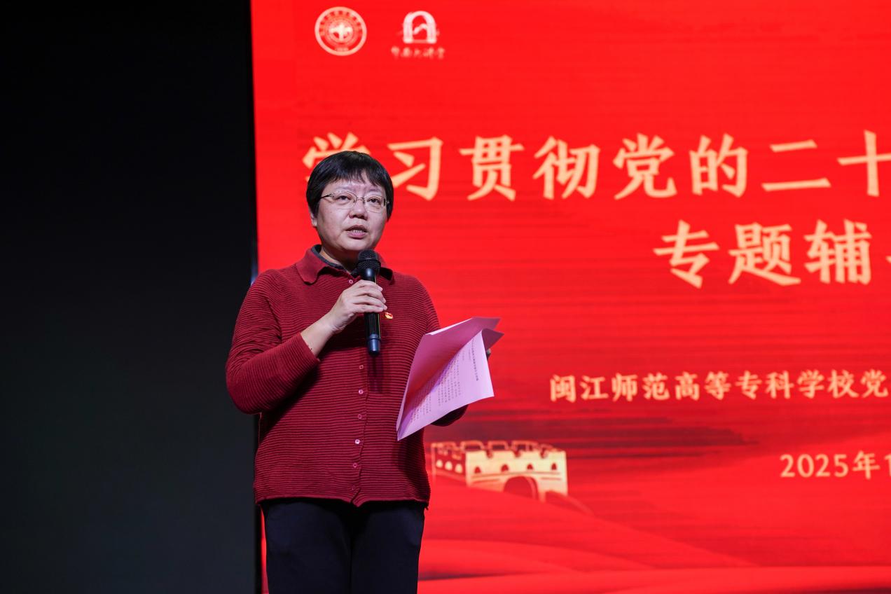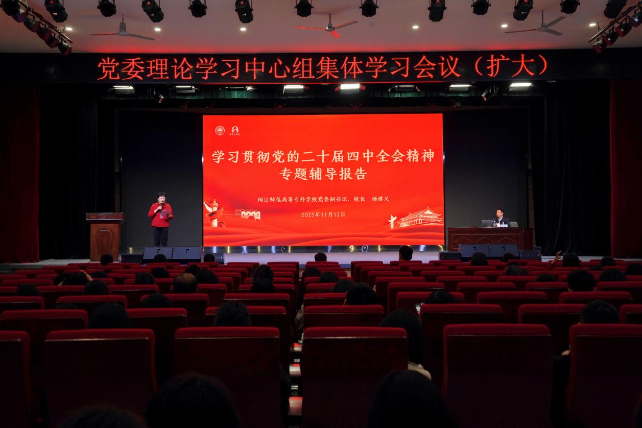 11月12日,我校召开党委理论学习中心组学习(扩大)会议,专题学习党的二十届四中全会精神。闽江师范高等专科学校党委副书记、校长杨建义教授受邀作专题辅导报告。报告会由校长任建红主持,学校党委理论学习中心组成员及全体教职工参加学习。