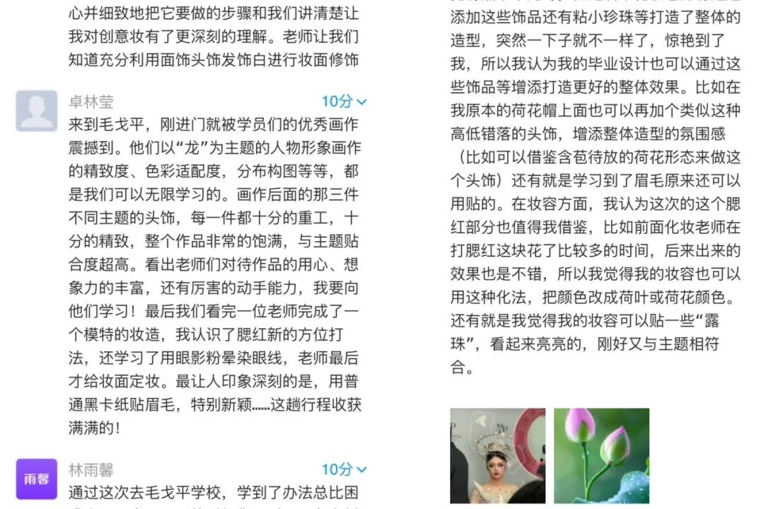 观摩传统技艺演示时,同学们被精湛的刺绣、巧妙的印染手法所折服。大家意识到,这些古老技艺能为服装增添独特的艺术魅力。同学们深刻感悟到传统工艺是一座取之不尽的宝库,将其与现代设计融合,定能为人物形象设计开拓出更广阔的创新空间 。