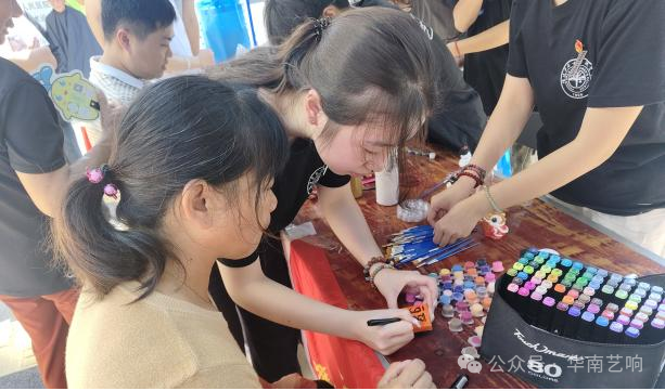 活动现场,我系青柠檬志愿服务队依托专业特色,准备的石膏彩绘、创意冰箱贴DIY等多元互动体验吸引了众多村民参与。在石膏彩绘时,志愿者们耐心示范,引导村民们先用大号画笔为石膏娃娃的衣裙铺上饱满的底色,再换上细笔,小心勾勒细节。村民们全神贯注地调色、涂抹,为纯白的石膏模型披上了缤纷的外衣。一旁的冰箱贴制作区同样气氛热烈,村民们用马克笔在素白底胚上自由创作,亲手为图案填充明艳亮丽的色彩。艺术带来的乐趣与成就感也油然而生,村民们也在美育互动中收获温暖与快乐。