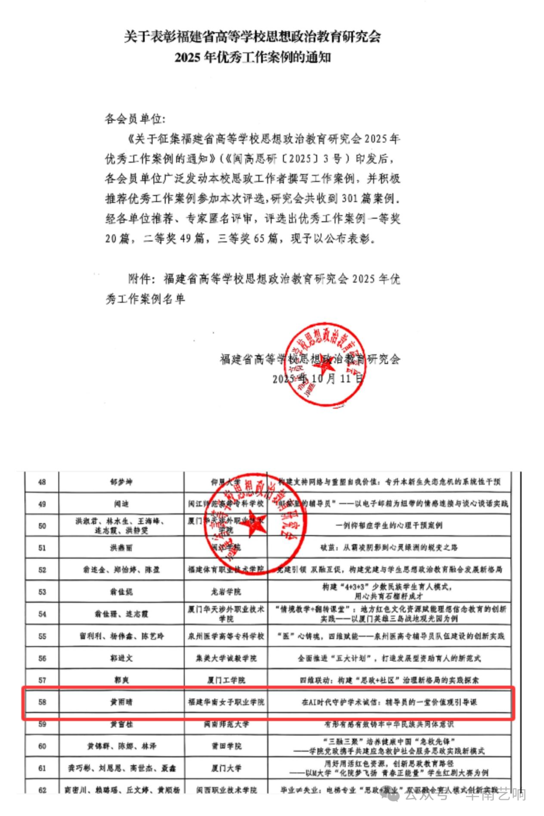 近日,我系辅导员黄雨晴工作案例《在AI时代守护学术诚信:辅导员的一堂价值观引导课》获评福建省高等学校思想政治教育研究会2025年优秀工作案例三等奖。