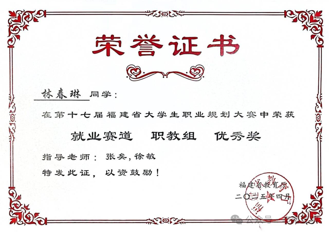 第十七届福建省大学生职业规划大赛已圆满结束,我系郑明烩(2023级服装与服饰设计)、林春琳(2023级数字媒体艺术设计五年专)两位同学在第十七届福建省大学生职业规划大赛中分别获得成长赛道职教组优秀奖、就业赛道职教组优秀奖。辅导员黄雨晴、张矣,数字媒体艺术设计专业教师徐敏获得优秀指导老师奖。他们立足专业特色,精心备赛,表现出扎实的职业素养,特此祝贺!