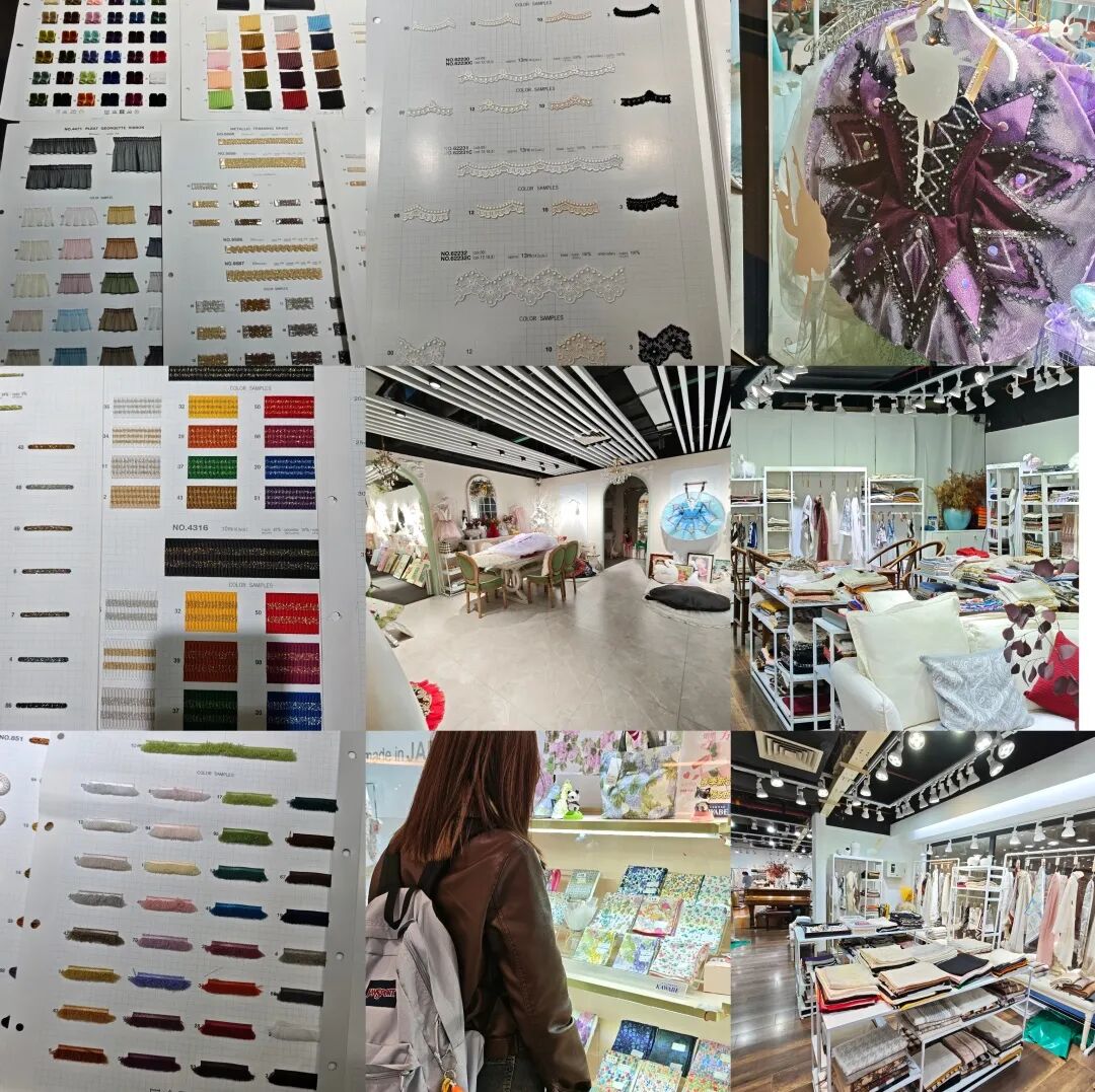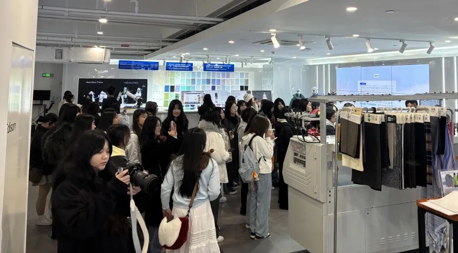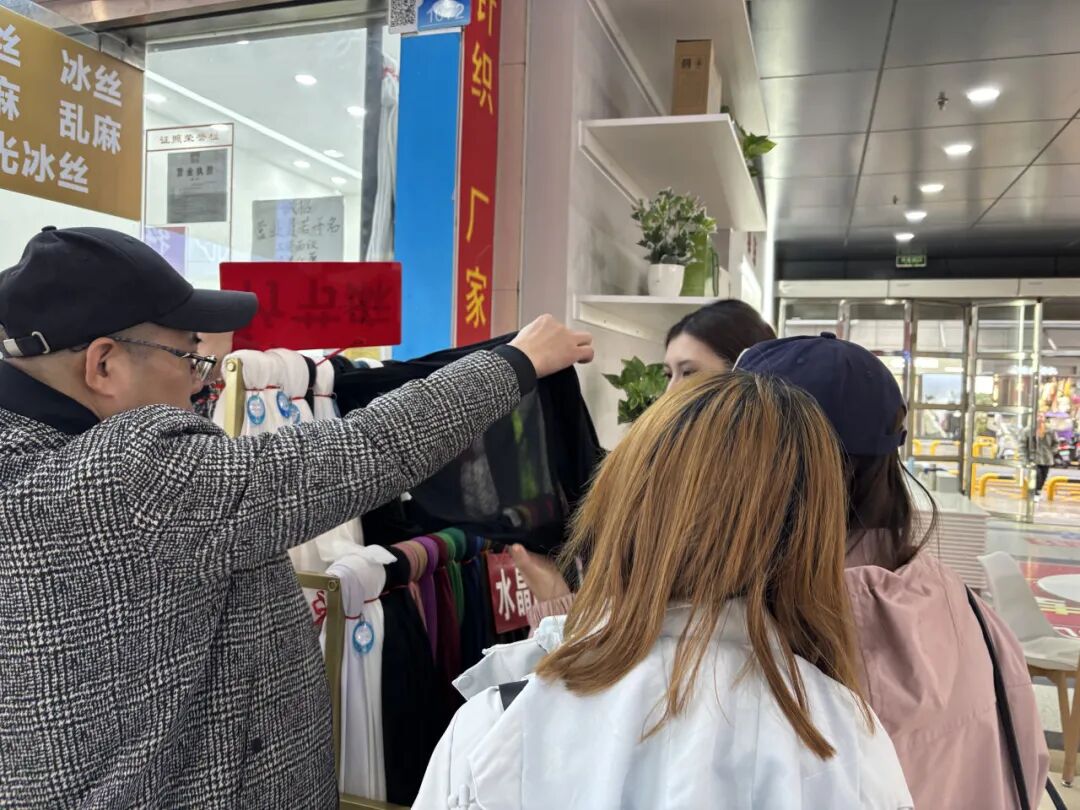 第一站,师生来到绍兴柯桥面料市场,主要考察各类面料的材质特性、纹理色彩、工艺处理、价格区间及流行趋势。通过实地考察,学生们对面料的材质、工艺和价格有了直观的认识,为将来的服装设计打下了坚实的基础。