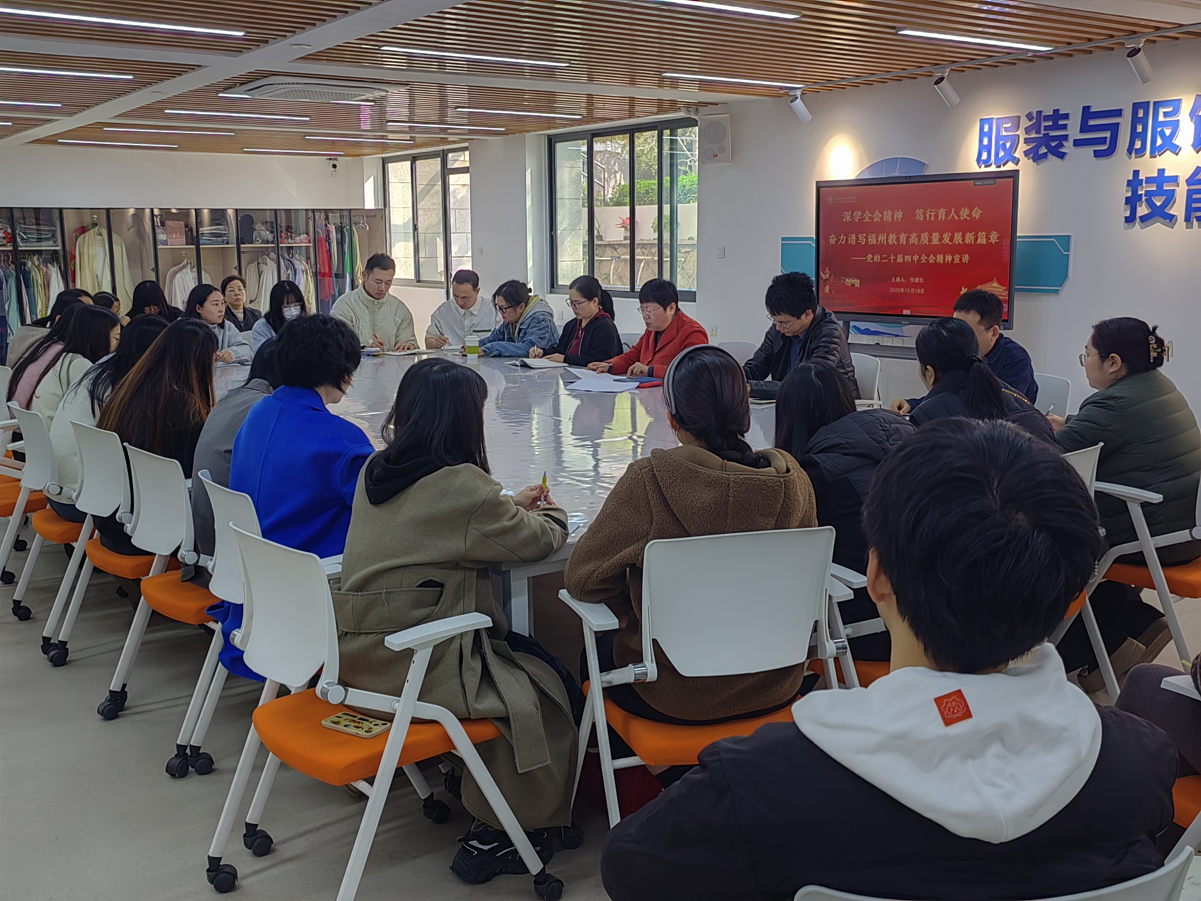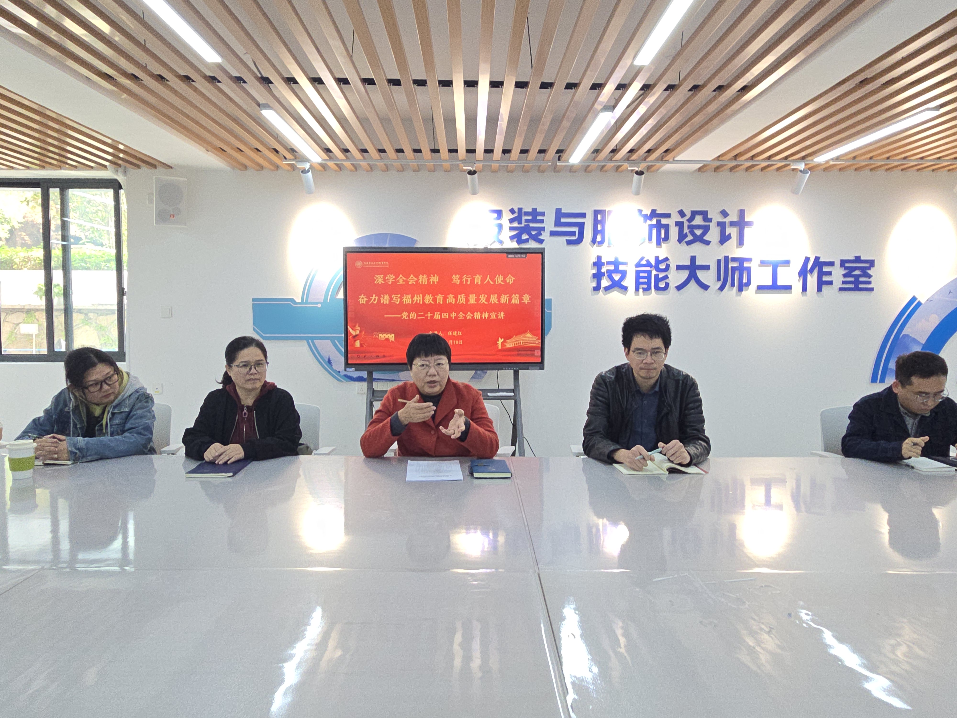 为深入学习贯彻党的二十届四中全会精神,切实将思想和行动统一到全会部署要求上来,12月18日,校长任建红深入艺术设计系,在实训楼2-002(技能大师工作室),以“深学全会精神 笃行育人使命 奋力谱写福州教育高质量发展新篇章”为主题开展专题宣讲。我系全体教职工参加宣讲会。