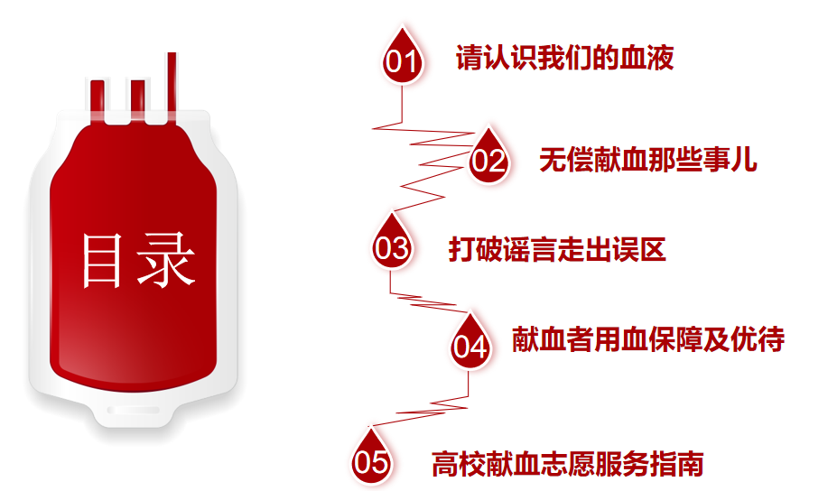 为了使同学们能够更了解献血相关知识,本次班会从五个部分切入。