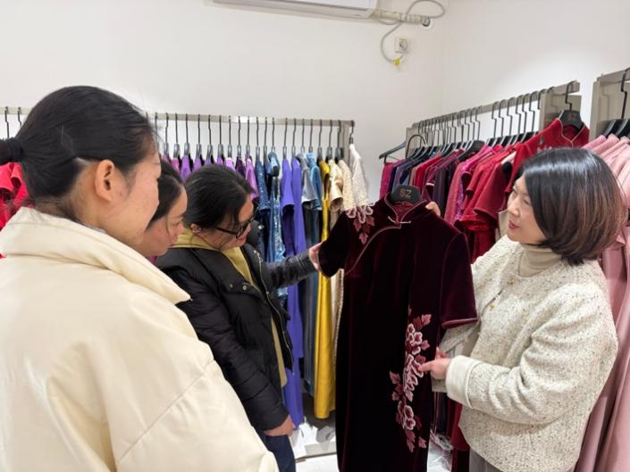 在企业负责人程小新女士的带领下,教师团队重点参观了“所罗定制”核心门店,程小新女士细致介绍了公司服装定制的主营业务、规模布局,还现场展示了定制旗袍、西服手工刺绣的关键工艺,让教师团队感受定制服装的品质魅力与品牌核心竞争力。